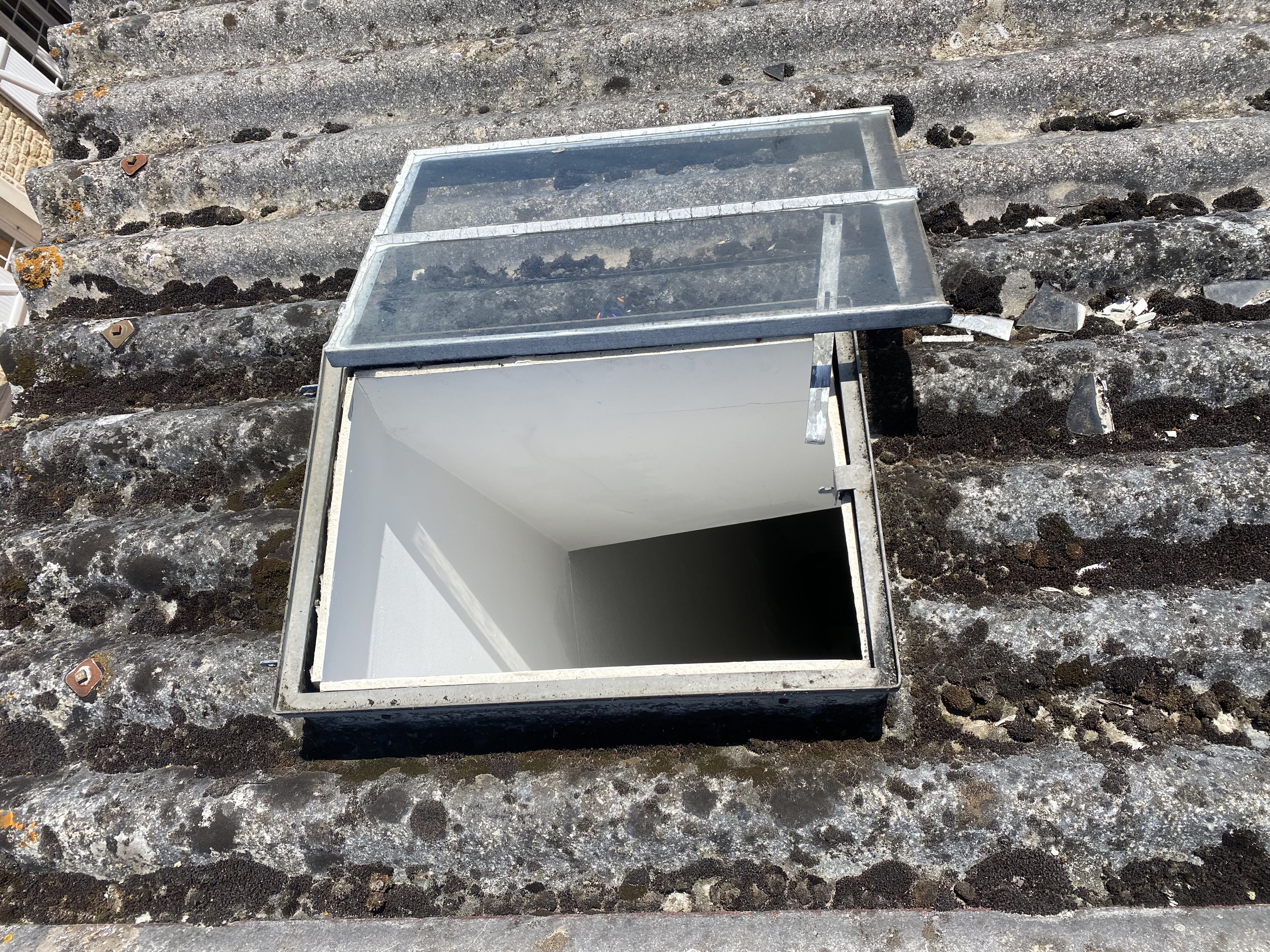 Voici le contexte: J’habite une maison à étage dans laquelle il y a un puit de jour dans la cage d’escalier. Ce puit de jour est constitué d’un ancien galoubier (trappe de toit) avec une vitre simple vitrage. Au niveau isolation et condensation ce n’est pas le top… On retrouve souvent des gouttes dans l’escalier et sur la vitre.