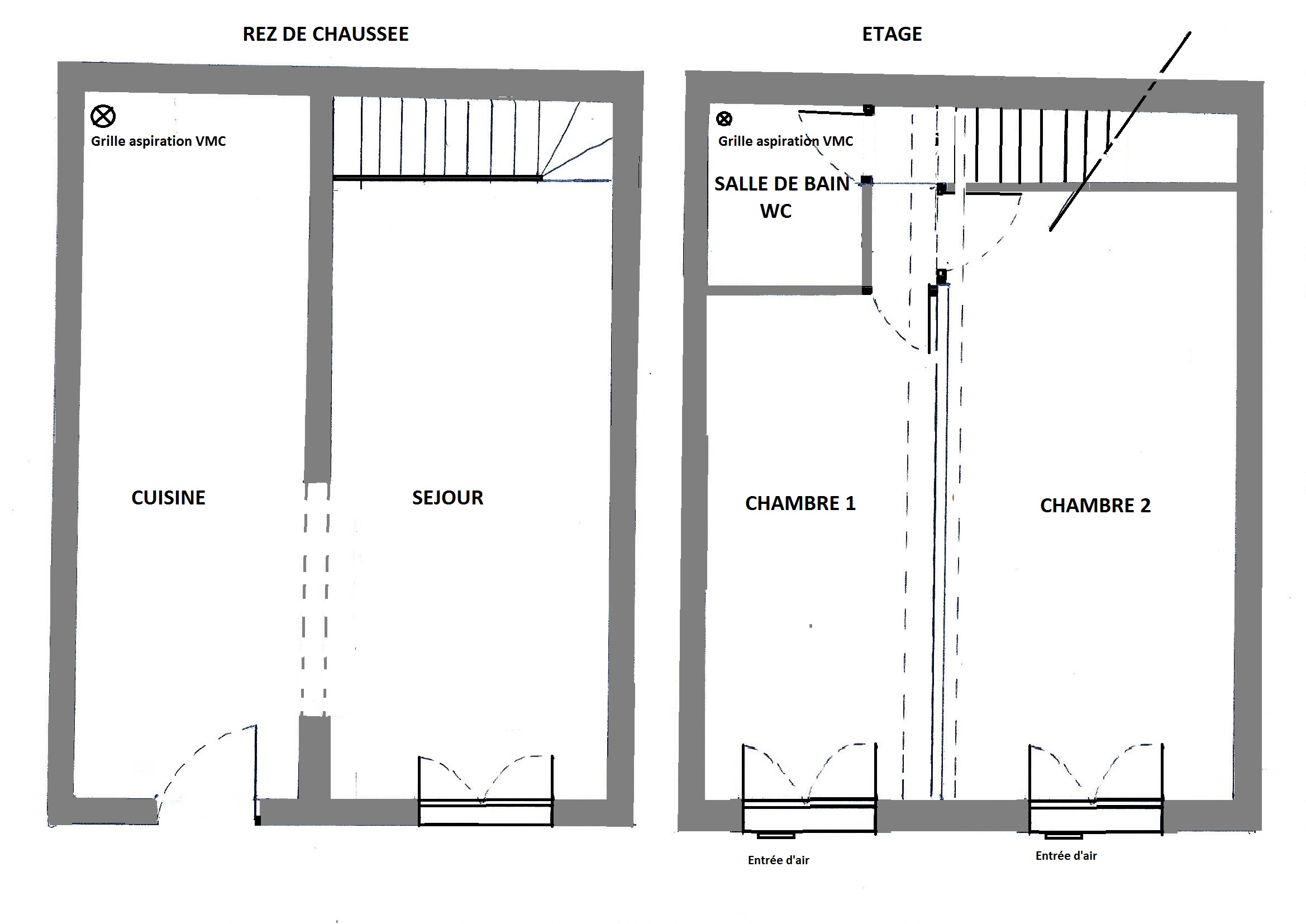 Dans la maison les chambres sont situées à l'étage avec la salle de bain/wc, il y a une entrée d'air sur la fenêtre de chaque chambre mais il n'y en pas dans le séjour qui lui est ouvert sur la cuisine.