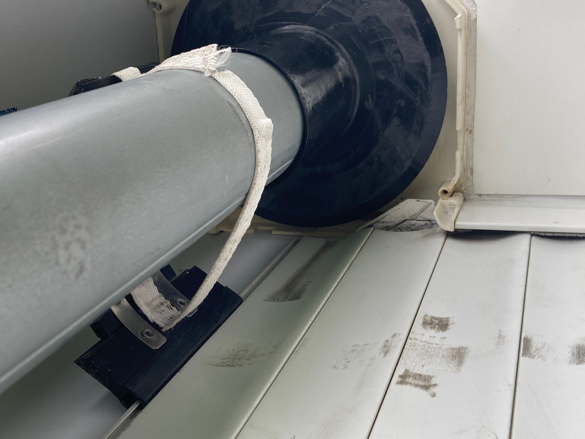 De plus l'attache a été réalisé sur le dernier (i.e. le plus haut) maillon du DVA, je pense que ça a été fait ainsi à cause de cette hauteur justement, parce que si les règles d'installation avaient été suivies il y aurait eu une grosse partie du DVA au-dessus de l'attache à devoir être enlevée comme le préconise le manuel d'installation ("L'élément du DVA tangent (tangent = qui n'a qu'un point de contact) au tube sera choisi pour la fixation......S'il reste des éléments inutilisables (DVA trop grand), il faut les supprimer en cassant les lames d'acier sur le DVA"), bref le DVA aurait été réduite à son strict minimum de 2 maillons.