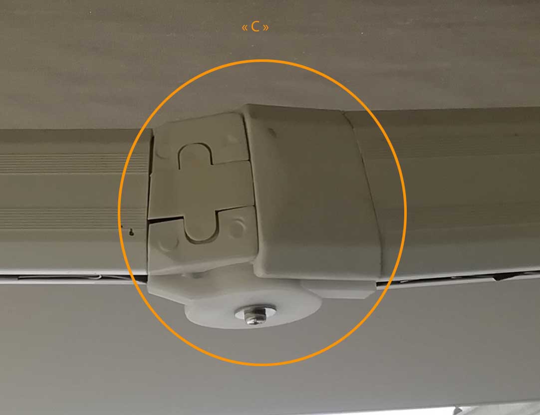 - D'un coté le dessus de rotules "C" qui touche la toile et le rebord supérieur de la barre de charge à la fermeture