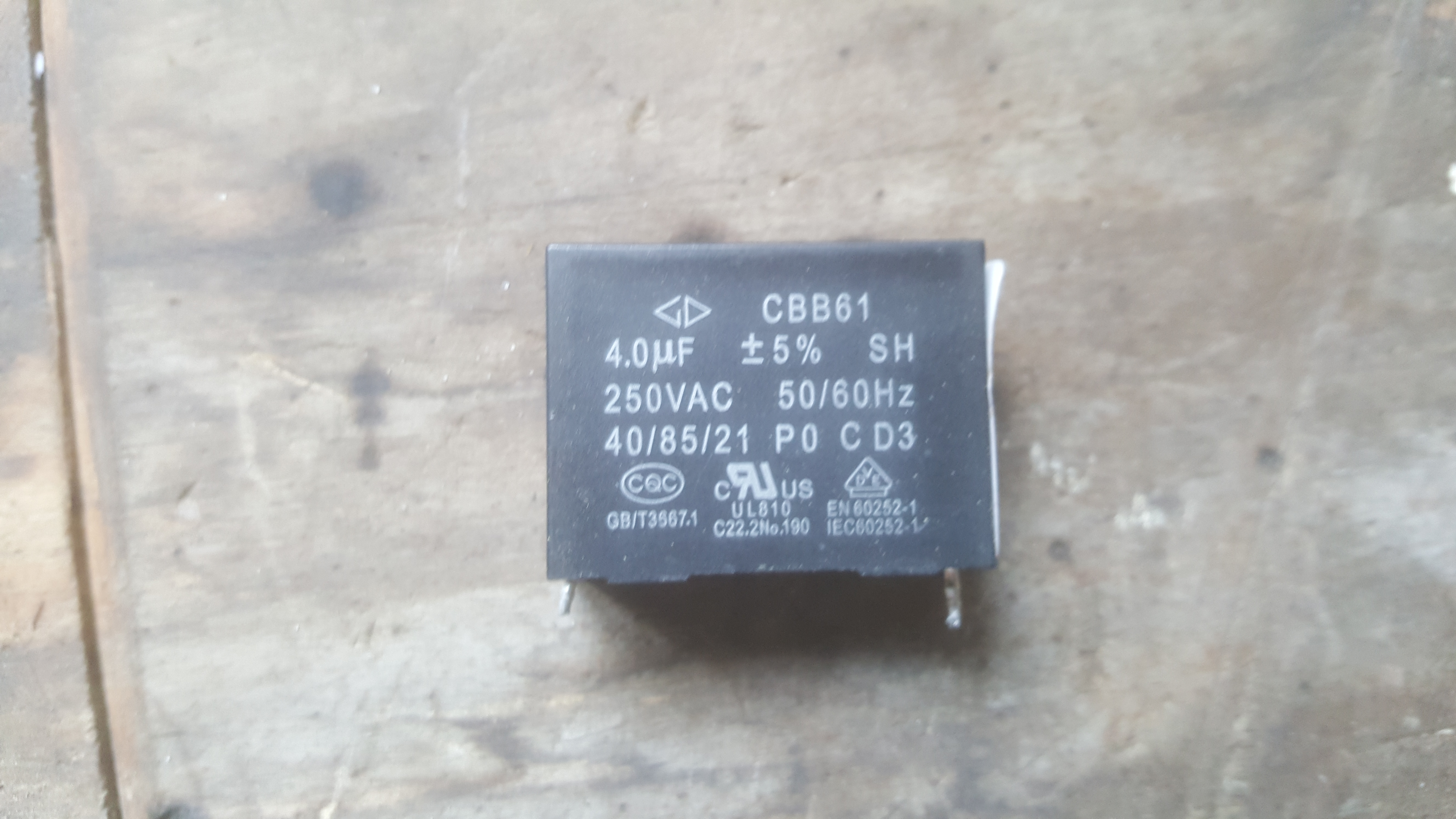 J'ai acheté un condensateur de démarrage de 4uF que j'ai connecté à mes deux fils. Il n'y a pas de polarité à respecter. Puisque le nouveau condensateur est trop grand pour rentrer dans le moteur, et que dans mon cas mon coffret de volet est caché par du bardage, j'ai décidé de carrément placer mon nouveau condensateur en dehors du coffret afin de simplifier une éventuelle réparation future :